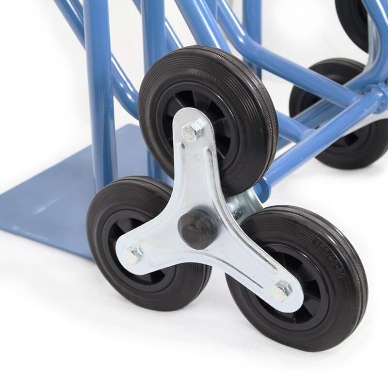 Le cœur de l'efficacité de ce diable réside dans son système de roues tri-étoilées. De chaque côté, trois roues robustes de 160 mm sont montées sur un axe pivotant, formant une "étoile". Lorsqu'il rencontre une marche, ce mécanisme permet à la première roue de s'accrocher et de monter, tirant le diable vers le haut, suivi par les deux autres. Ce mouvement de "marche" mécanique réduit considérablement la force de levage nécessaire par l'opérateur, qui se concentre alors sur l'équilibre et le contrôle plutôt que sur la puissance pure. Il s'agit d'une avancée majeure en matière d'ergonomie, minimisant le stress sur le dos, les épaules et les bras, ce qui est crucial pour la prévention des Troubles Musculo-Squelettiques (TMS).