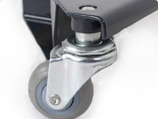 L'efficacité des Coins Roulants CR600-BOX repose sur leur système de roulement. Chaque coin est équipé de trois roues pivotantes à 360 degrés. Cette configuration de mobilité complète permet de faire tourner la charge sur elle-même et de la manœuvrer facilement dans toutes les directions, même dans des espaces très restreints (couloirs étroits, pièces encombrées). Les roues ont un diamètre optimisé de 50 mm avec une largeur de 20 mm et sont fabriquées en caoutchouc. Ce matériau est essentiel car il offre une excellente résistance à l'abrasion et à l'usure, tout en garantissant une bonne adhérence et un roulement silencieux, protégeant les sols sensibles des rayures et des marques.